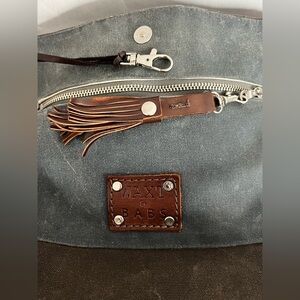 This is a unique bag made by Rhode Island designer. It is a blue and brown waxed canvas bag. It has leather strap & leather accessories, tassel, key chain.. magnetic strap closure. Crossbody strap is removable. bag purse satchel body measures 12x11x4. 12” wide, 11” tall and bottom base measures 4” depth. Please see all photos for description of this item. The outter canvas has a distressed /worn appearance due to the waxed canvas.