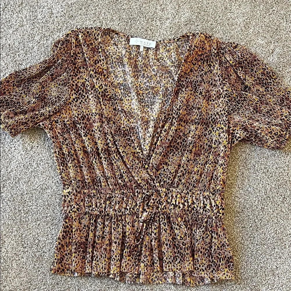 Chic V-neck blouse with a stylish pattern. Features a flattering fit and short sleeves. Ideal for versatile styling. Size larger. Good condition