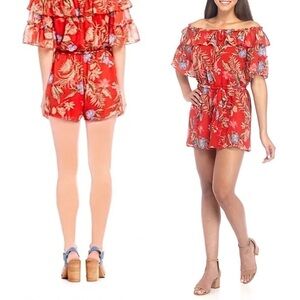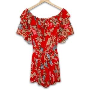 WAYF 70s Tropical Floral Off Shoulder Short Sleeve Ruffle Tier Tie Waist Romper
