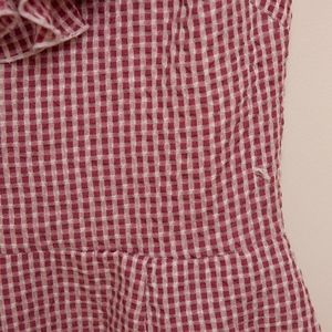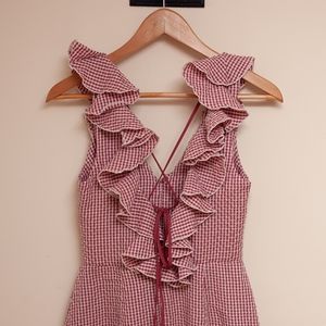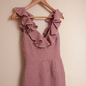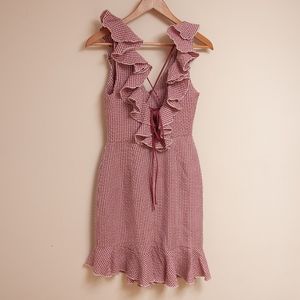 Dreamy ruffles highlight the neckline and asymmetrical hem of this pretty check-print dress. Fit: this style fits true to size. Back zip closure - V-neck - Sleeveless - Lined - Imported