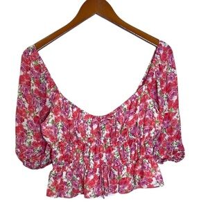 WAYF Avra Pink Red Floral Sweetheart Neckline Cottage Core Peplum Top sz L NWT