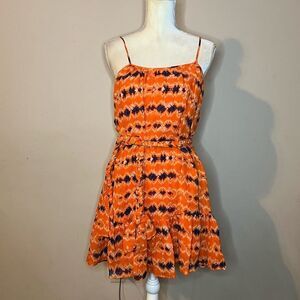 Vibrant orange sleeveless dress with a stylish pattern, perfect for summer outings.