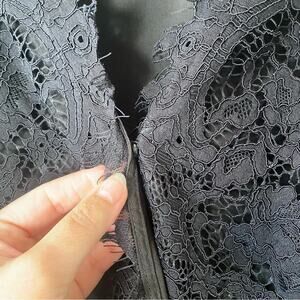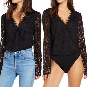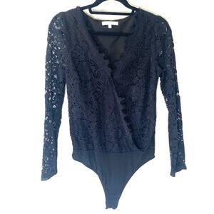 Excellent used condition! Beautiful black lace crocheted bodysuit. Sheer long sleeves with a lined bodice. Surplice V-neck with a whispy scalloped yoke. Elastic thong bottom with two snap button closure. A great blouse for semi-casual wear.