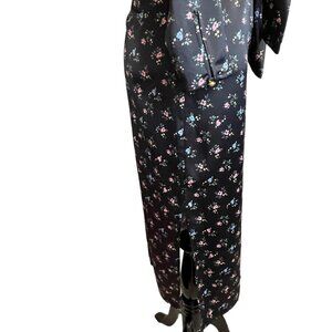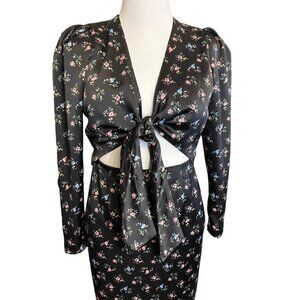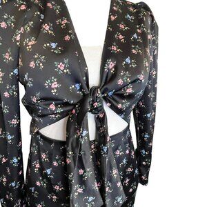 WAYF Black Ditsy Floral Dress Satin Tie Bare Midriff Satin Puff Sleeve Size Medium