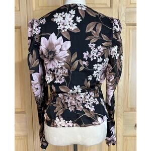 WAYF Black Floral Puff Shoulder Crossover Surplice Peplum Blouse Top Sz XS