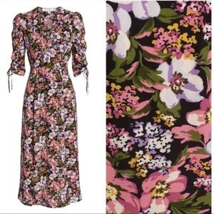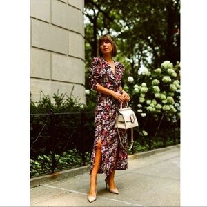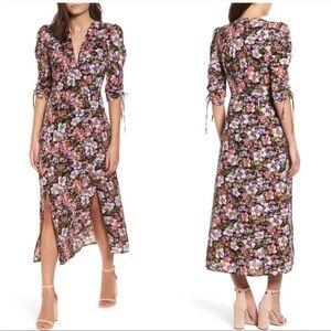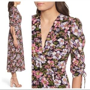 Ruched sleeves provide a fresh update for a flowy dress in a vivacious floral print. This dress features a surplice v-neckline, ruched tie sleeves, puff sleeve, cinched waist for a flattering fit, two leg slits, partially lined. Hidden side zipper closure.