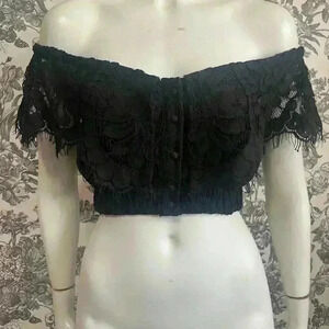 Wayf Casoria black lace off shoulder crop top. Sumptuous eyelash trim lace collar. Front closes with tiny covered buttons. Bodice is lined, cap sleeves are sheer. Gathered elasticized bottom. Beautiful condition.