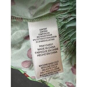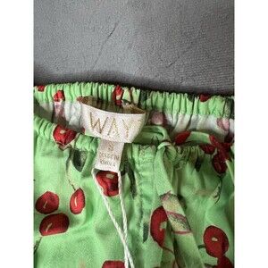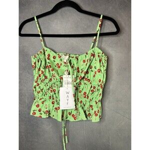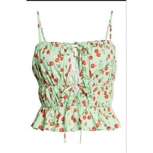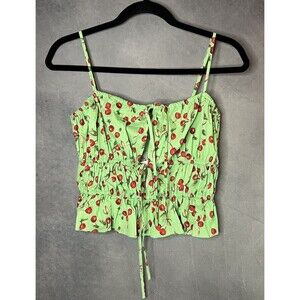 WAYF Cherries Green Camisole Top Elastic Trim Cotton Front Cut Out Ties Women S