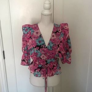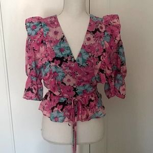 WAYF Colorful Floral Print Wrap Blouse Puff Sleeve