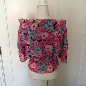 Oversized floral print and feminine ruffle detail makes this the perfect shirt for a fun day or night out. Black with vibrant pink, and blue accents that will liven up your look. In a wrap style with ties and a v neckline. Short sleeves with elasticized cuffs with ruffle. Slightly cropped with a peplum hen. 100% polyester for easy fit and care.