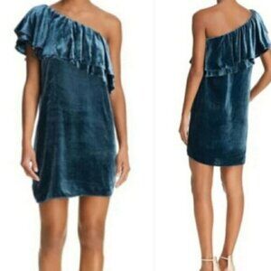 WAYF Dress SZ S Teal Green Velvet Ruffle Cocktail One Shoulder Soft Lined NEW