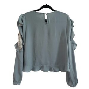 WAYF Dusty Blue Lace Panel Ruffle Sleeve Pearl Button Top Shirt Blouse - Small