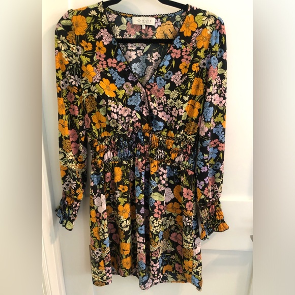 WAYF floral print dress, perfect for spring/summer! Elastic waist and sleeves with snap front closure. Lightweight. Shoulder to dress bottom is 35 in. NWOT. Polyester, delicate cycle. Size medium