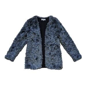 Acrylic/Polyester/Spandex, Made in USA, Open front, long sleeve, dark slate gray color with a blue-ish hue, has pockets, plush faux fur, fully lined.