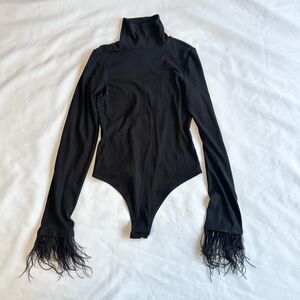 The classic ribbed turtleneck bodysuit gets a dose of added glam with a flourish of fabulous feathers at the cuffs. Turtleneck Long sleeves 65% rayon, 27% polyester, 8% spandex