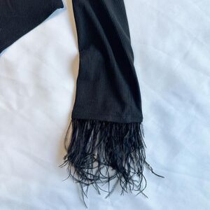 feathered cuffs, ribbed turtleneck, long sleeve, elegant, sophisticated, night out, glam, black, fitted, chic