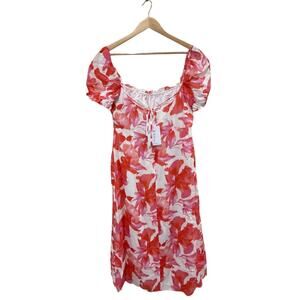 Ruffle trim highlights the square neckline and puff sleeves of this floral-patterned midi dress.