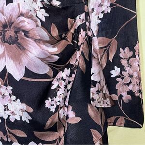 Beautiful floral print with V-neck, side zipper, and faux wrap, long sleeves. Great for late summer evening and early fall . It is a very pretty dress in person.