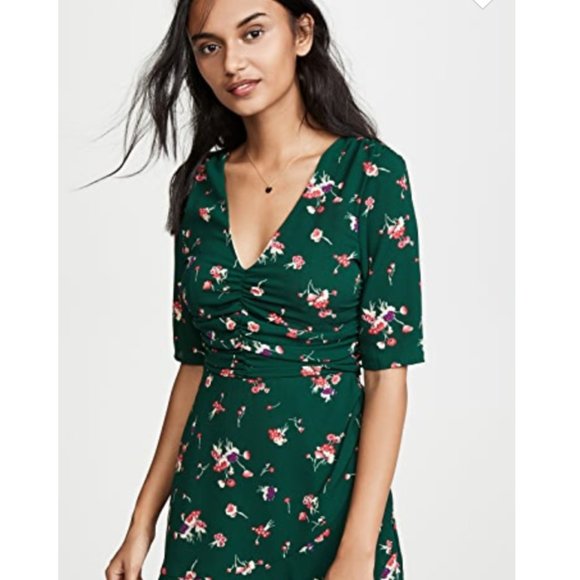 Be a vision in green in this pretty WAYF mini dress. Romantic ruching and a cascade of petals make this silhouette even more enticing.