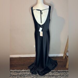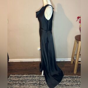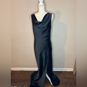 Glossy satin adds extraflattering slink to this cowl-neck gown designed with a slit-hem skirt that beguiles with every step.