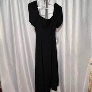 Style Leonie Puff Sleeve Midi Dress. Classic black midi featuring a square neckline, corset-style bodice, and puff sleeves with elastic cuffs. Smocked back with hidden zipper. Elegant drape and flattering shape. MSRP $99.
