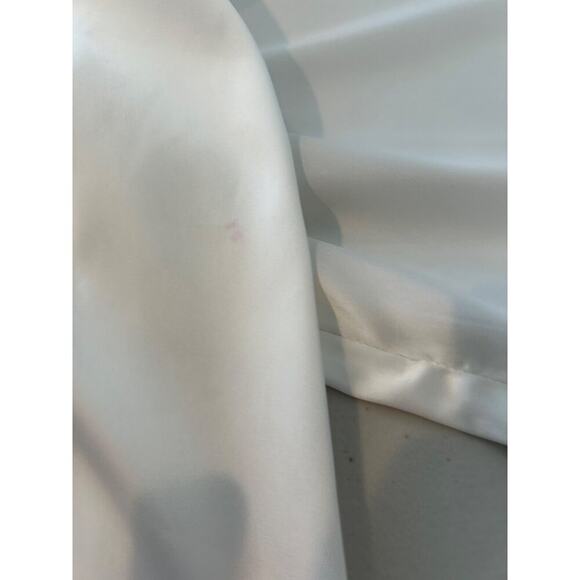 This versatile cream satin top is a must-have addition to any wardrobe. Its elegant V-neckline and long sleeves create a sophisticated look, while the spaghetti straps add a touch of femininity. The side zipper closure ensures a secure fit, making it suitable for a variety of occasions. Small blemish shown in last photos. Have not tried to remove.