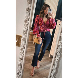 WAYF Loral Print Ruched Plunge Neck Satin Blouse Pink Berry Floral Long Sleeve