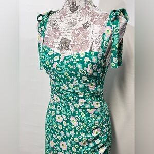 Kelly green floral Malibu midi dress from WAYF, Size S. Dress has adjustable tie shoulder straps and ruched waist and skirt.