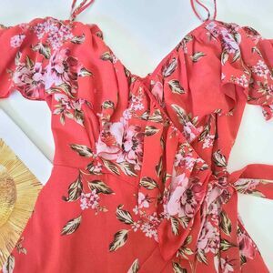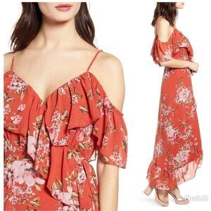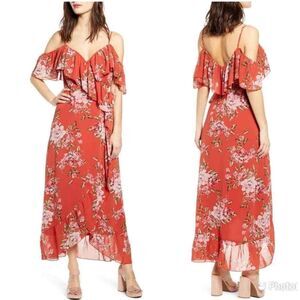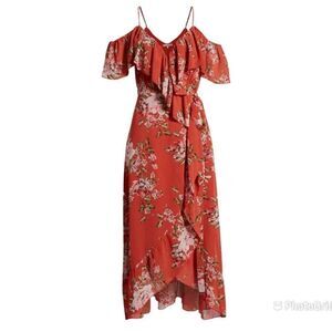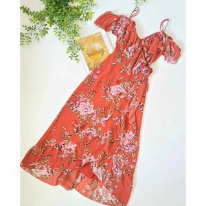 WAYF Nanette Floral Ruffle Wrap Off the Shoulder Dress Features: Be the belle of the backyard party in this charmer of a dress, ruffled to show off your shoulders and cut to a graceful, ankle-skimming length. Wrap silhouette Surplice V-neck Cold-shoulder sleeves Ruffle hem Partially lined 100% polyester Color: Rust orange with floral print Size: Small Condition: Excellent pre-owned condition, only flaw is clasp on neckline is missing, see last picture tags: fall, autumn, flowy, bohemian, boho, trend color, hi low, wedding guest