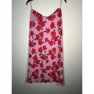 Charming pink skirt featuring a romantic red rose floral print. Perfect for warm weather events and summer parties, this dress adds a touch of elegance to any occasion. Ideal for a garden party, a brunch date, or an evening cocktail event.