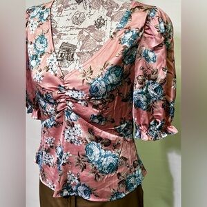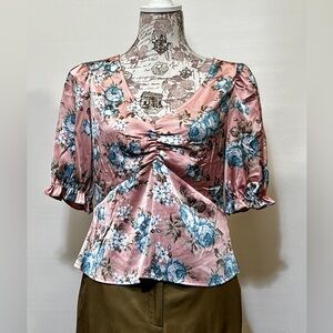 Pink and blue floral silky top from WAYF, size S. Top has gathered front and smocked sleeves and zip back.