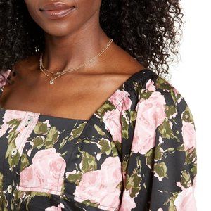 Elbow-length blouson sleeves and a square neck frame a romantic blouse that buttons down the front.