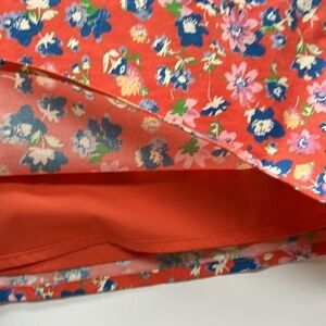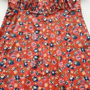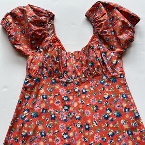 WAYF Ditsy Print Red Floral Puff Sleeve Milkmaid Mini Dress. Pretty red-orange color with blue/yellow/lavender flowers. Fully Lined. 97% cotton, 3% spandex. Puff sleeves with elastic at arm. Elastic around neckline with working drawstring. Back has zipper/hook & eye closure. Excellent condition. Size Medium
