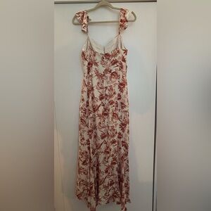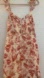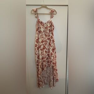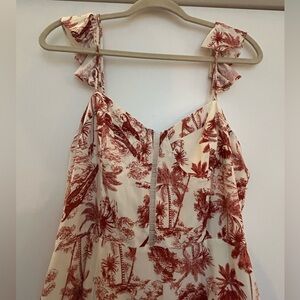 Stylish dress with a red and white tropical print. Features ruffled straps for a chic look.