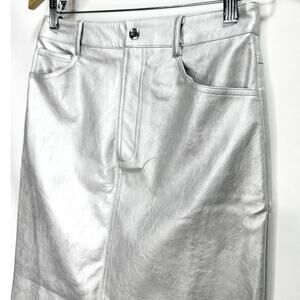 WAYF Silver Vegan Leather Midi Skirt | Metallic Faux Leather | Size XS
