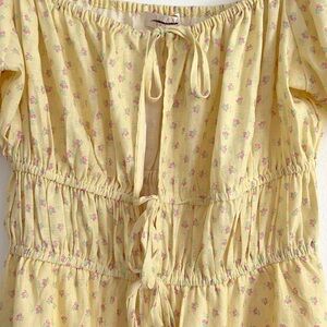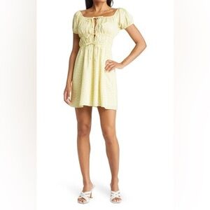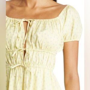 WAYF Sinclair Ditsy Floral Yellow Off The Shoulder Linen Mini Dress Tie Front