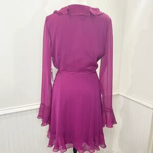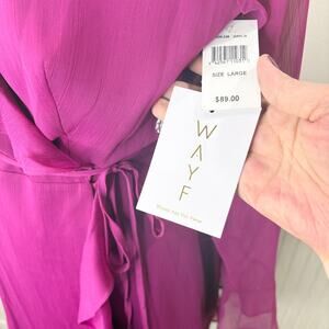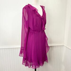 WAYF Size L Chiffon Wrap Mini Dress Ruffle Sheer Bell Sleeve Coquette Wedding