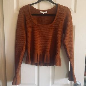 Super cute for fall, rust peplum sweater with ruffle trim on the bottom and wrist cuffs. Beautiful and has lots of stretch!