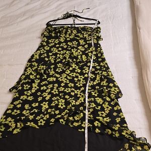 Chic strapless dress with a lively green floral design. Flowy and stylish for any event.