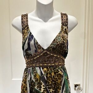 This is such a cool dress - the print is insane, the cut is figure flattering and the beading at bust is the cherry on top! There is no size tag but I would say it looks like a small or medium. New without tags.