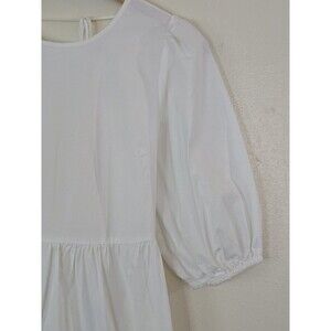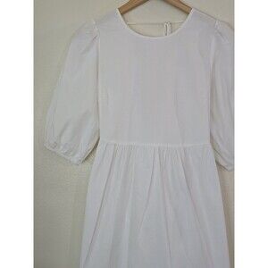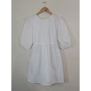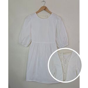 WAYF White Mini Dress Womens Size Small Puff Sleeves Open Tie Back Cotton POCKET