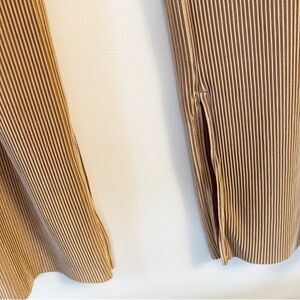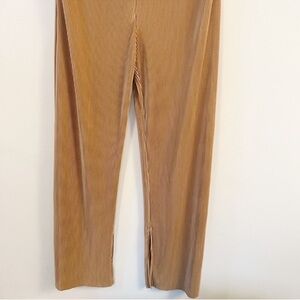 Brand new. Shiny gold Tan color. Effortlessly chic palazzo pants. High rise. Pull on. Elastic waist. Ribbed knit. Slits at hem.
