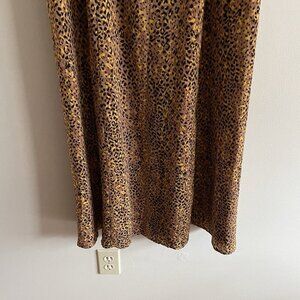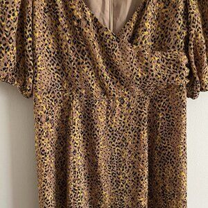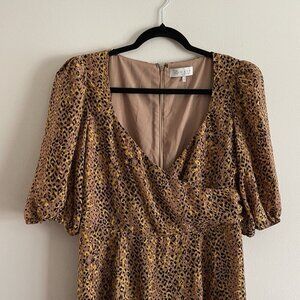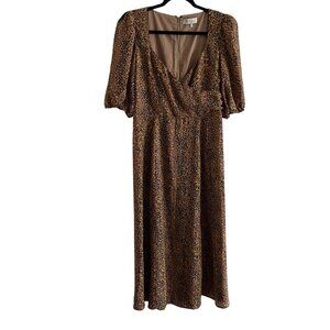 WAYF Women L Leopard Print Boho V-Neck Puff Sleeves Faux Wrap A-Line Midi Dress.