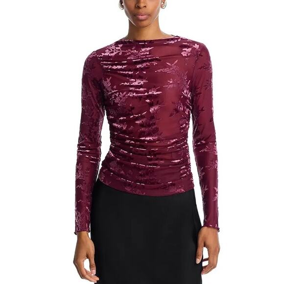 WAYF Women Merlot Red Floral Sheer Jersey Ruched Long Sleeves Slim Top Size XS