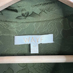This WAYF button-up shirt is designed for women and comes in a regular size M. It features a collared neckline and long sleeves, with a floral pattern in green. Made from a blend of polyester and spandex, it offers a regular fit suitable for casual occasions. Manufactured in China, this shirt is new.