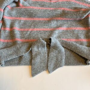 Cozy. Comfortable. Pullover. Round ribbed neck. Long sleeves with ribbed cuffs. Ribbed bottom with built in front tie. Light gray with pink stripes. Stretch material. Casual. Warm. Nordstrom. Bin B