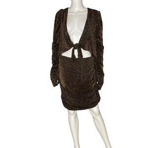 Metallic threads bring festive shimmer to a long-sleeve minidress with a tie bodice and cutouts at the waist. 60% nylon, 32% metallic fibers, 8% spandex
