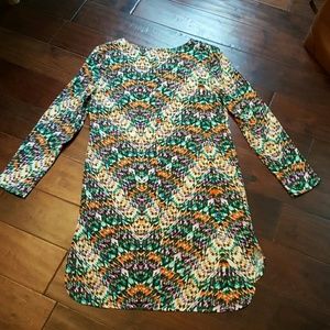 High in front, low in back, shows off the legs in a fun, flirty way, with modesty everywhere else. 37" from collar/ top of shoulder to bottom in back, and 34" from the front. Slits on sides from collar/ shoulder to 30 " down. Zips up from back. Long, fairly lose sleeves. Dress it with booties, boots, heels, tights for day or night. Fun pattern! Purchased from Anthropologie.