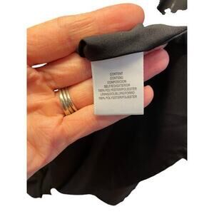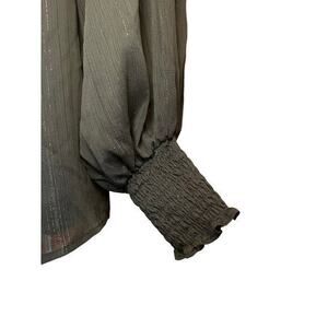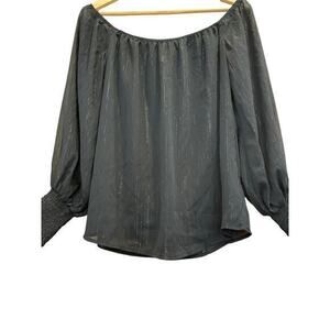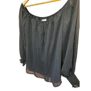 WAYF x BFF Sarah Silver Metallic & Black Off the Shoulder Top Sheer Long Sleeves. Size Medium. Off the shoulder style, front tie neckline giving a Boho Chic peasant top style to it. Top is in excellent used condition.