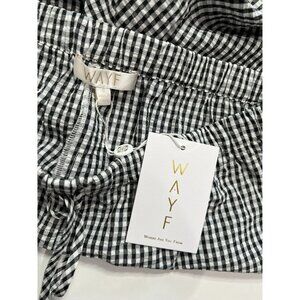 Description from retailer: These straight leg pants from WAYF are crafted from a crisp, lightweight seersucker in a gingham check print. These relaxed pants feature an elastic drawstring waist. The material is composed of 75% polyester and 25% cotton. The pants are straight.
